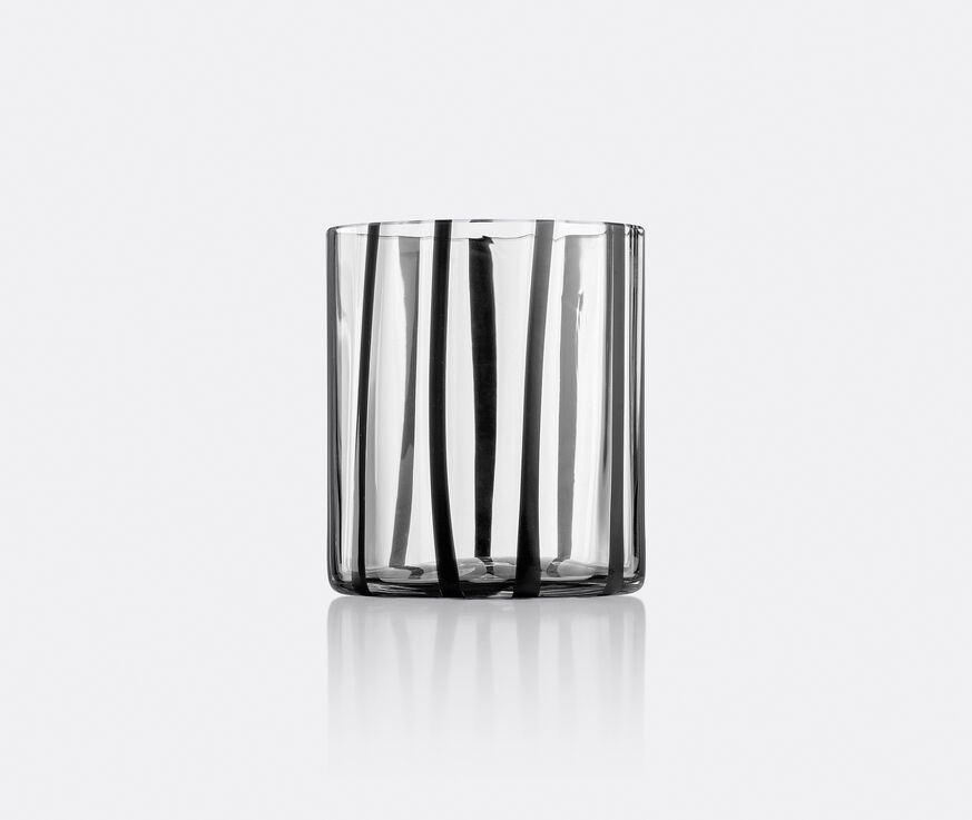 NasonMoretti's joyful collection of murano glass vessels celebrates the circus in a troupe of striped designs. This otherwise simple drinking glass is dressed with opaque filaments of playful black stripes. The design, which creates an atmosphere of stylish spontaneity, can be mixed and matched with glassware from the series in shades of blue, yellow, red, and white, to spectacular effect. The artisanal nature of the piece makes each 'Cyrcus' tumbler glass subtly unique.