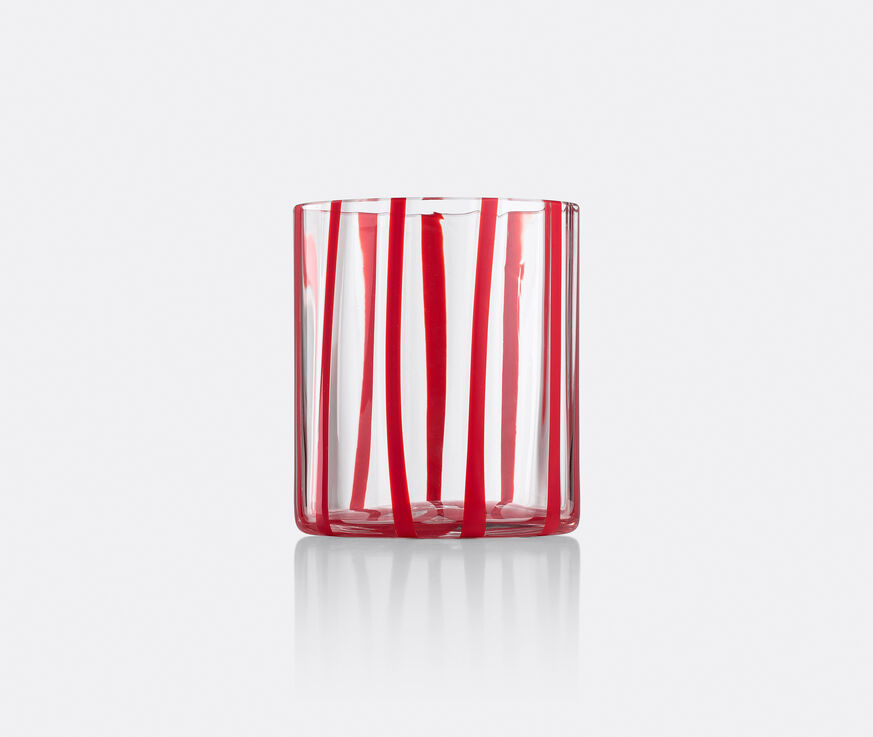 NasonMoretti's joyful collection of murano glass vessels celebrates the circus in a troupe of striped designs. Brightening up tables, this otherwise simple drinking glass is dressed with pigmented filaments of color in painterly coral red stripes. The design, which creates an atmosphere of stylish spontaneity, can be mixed and matched with glassware from the series for a spectacular effect. The artisanal nature of the piece makes each 'Cyrcus' tumbler glass subtly unique.