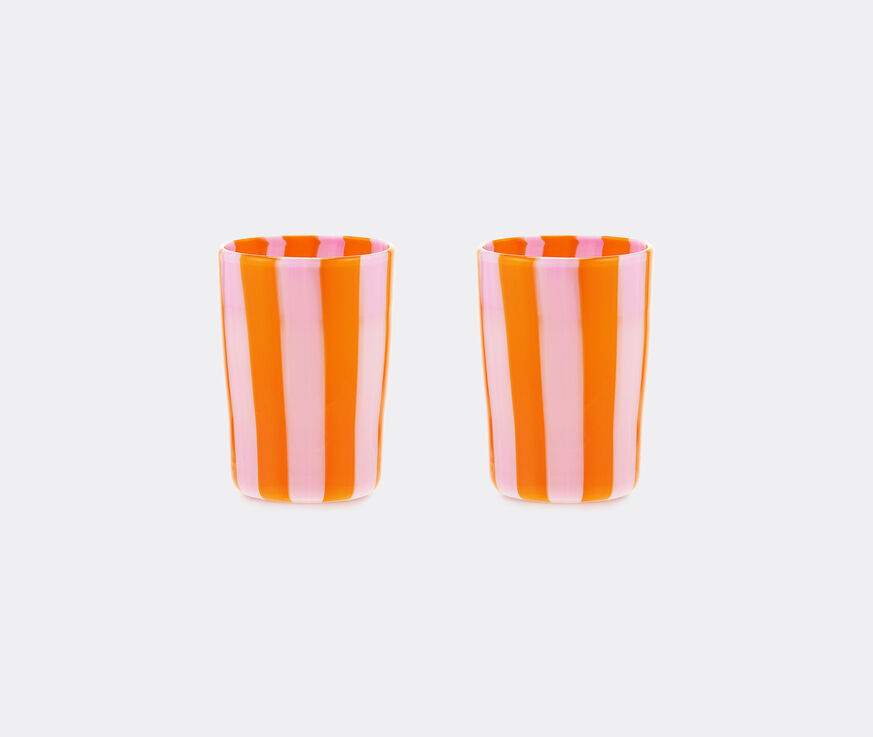 This delightful 'Dolcevita Stripe' tumbler, which comes as a set of two, is defined by bold contrasting stripes in an absorbing orange and pink colorway. The passionate and playfully uneven stripes reflect this mouthblown piece’s entirely manual production, alongside Aquazzura Casa’s characterstic devotion to surface decoration and striking color and pattern.