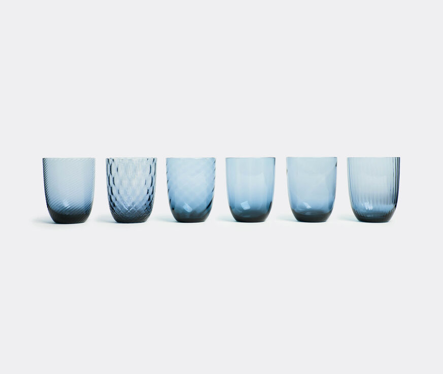 Born from designer Stefano Marcato's passion for the glass-making process, the 'Idra' water glass set combines six distinct textures for a collection that is at once original and harmonious. Produced by NasonMoretti, the unique glass surfaces span lens, rigadin, balloton, rigadin twisted and twisted optical designs, each one engraved into the blue glass while it is still hot, in true Murano tradition.