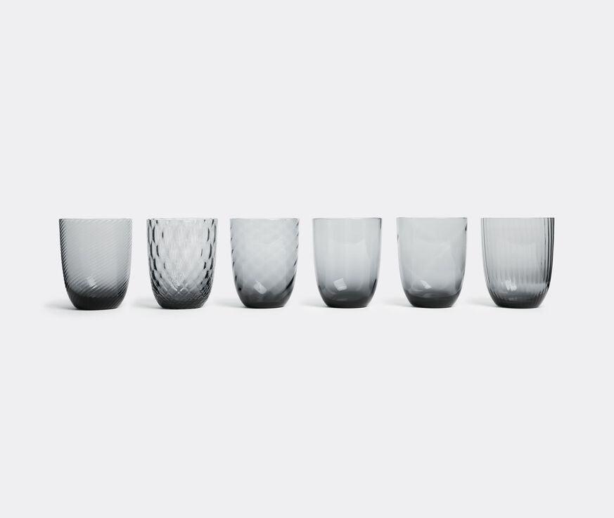 Born from designer Stefano Marcato's passion for the glass-making process, the 'Idra' water glass set combines six distinct textures for a collection that is at once original and harmonious. Produced by NasonMoretti, the unique glass surfaces span lens, rigadin, balloton, rigadin twisted and twisted optical designs, each one engraved into the grey-coloured glass while it is still hot, in true Murano tradition.