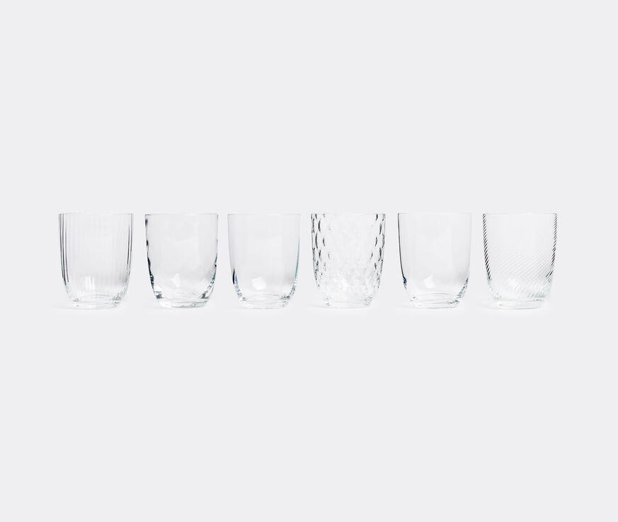 Born from designer Stefano Marcato's passion for the glass-making process, the 'Idra' water glass set combines six distinct textures for a collection that is at once original and harmonious. Produced by NasonMoretti, the unique glass surfaces span lens, rigadin, balloton, rigadin twisted and twisted optical designs, each one engraved into the glass while it is still hot, in true Murano tradition.