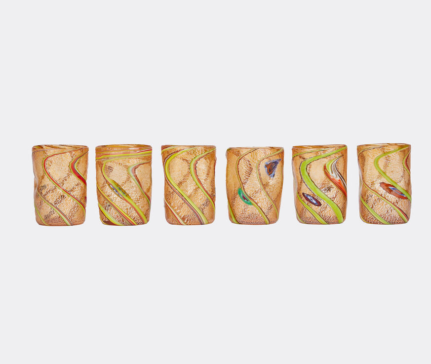 Fully encapsulating the spirit of Casa Cabana, where timeless elegance, artisanal methods and bold color define every item, the 'Pennellate' water glasses are like a breath of fresh air on the table. Handmade by artisans on the Venetian island of Murano, this set of six glasses are distinct for their handmade nature and each feature swirling patterns in shades of green, yellow, and red set over a smoky amber finish.