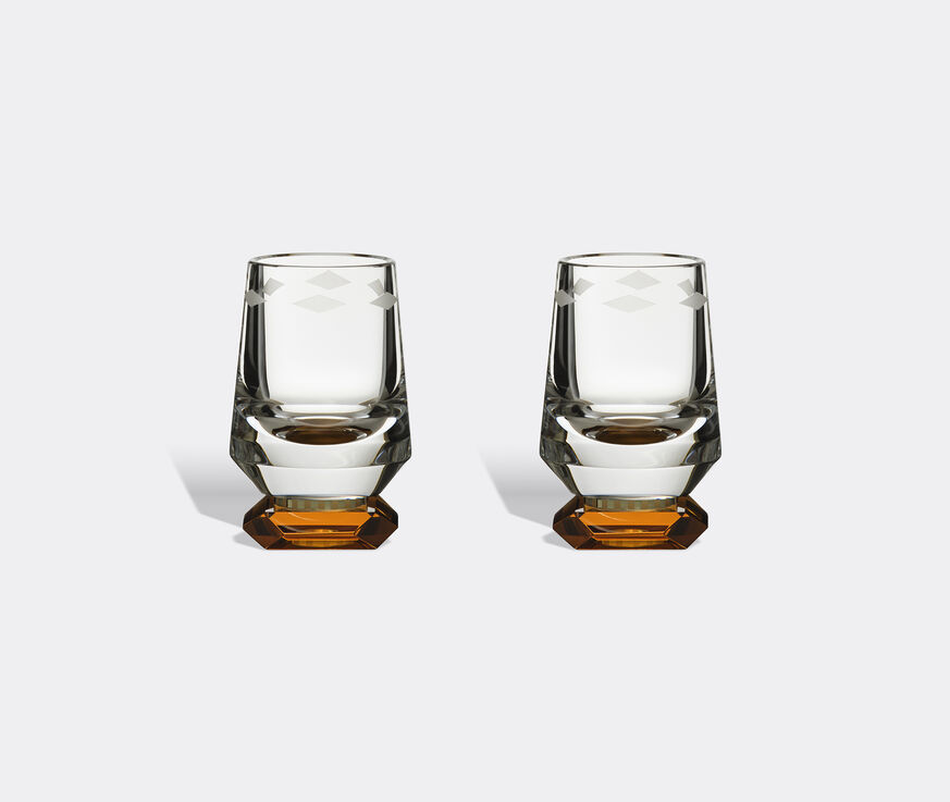 Small and striking, the 'Savor' glass by Reflections Copenhagen combines heritage cues with cutting-edge glasswork. Crafted in fine hand-cut crystal the design features a stunning bevelled amber foot that supports a double-walled cup with etched geometric facets. Sharp angles and curves, and colorless and richly pigmented crystal, create satisfying contrast and juxtaposition. This set of two glasses blends beautifully with drinkware from the 'Amber Dusk' collection, which captures the atmosphere of twilight and the elegance of the soirée.