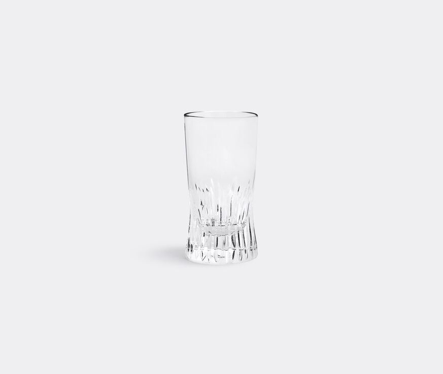 From J Hill's Standard's Cuttings series, this lead crystal water glass is designed for frequent, everyday use. Conceived by Italian-born, London-based designer Martino Gamper, the Cuttings collection is recognisable for the deep and distinct markings which pattern the surface of each piece which, due to their impressive depth and detailing, appear more sculptural than decorative. This glass features a linear pattern and holds 150ml.