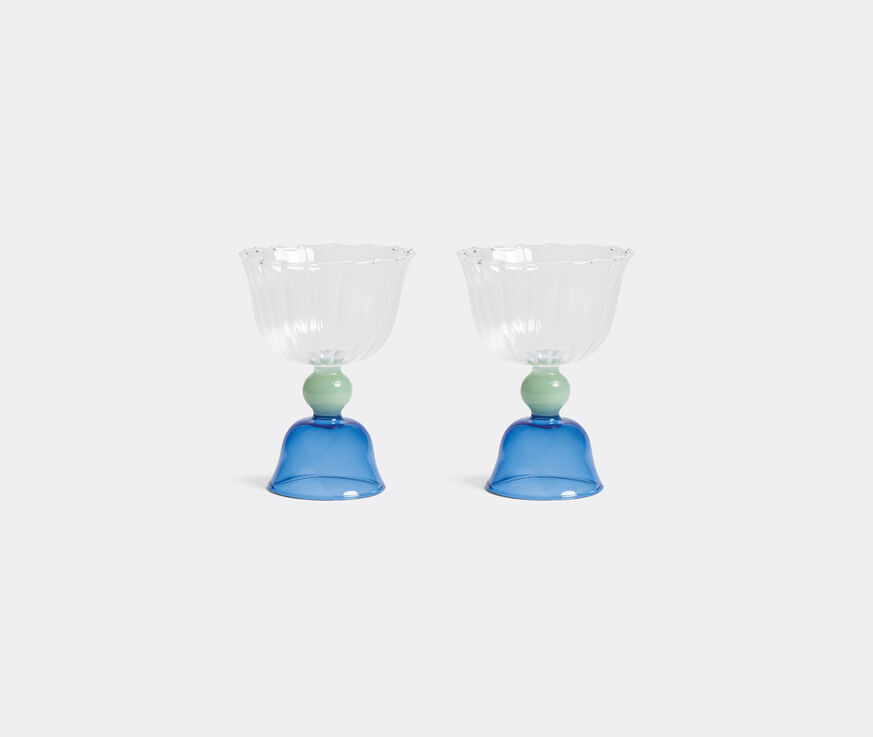 A study in opacity and form, the tripartite 'Tulip' glass by &k Amsterdam is a singularly elegant drinking vessel. The piece sees an inverted blue glass foot support an opaque ball of green glass, topped with an intricately textured, clear drinking bowl. The spherical stem makes for a satisfying grip. Curved and wavy lines reflect the form of the tulip in a shapely and delicate final design. This showstopping piece comes as a set of two, and can be combined with the matching carafe by &k Amsterdam.