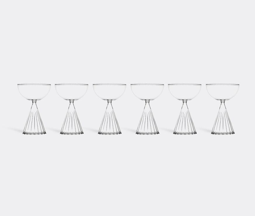 Designed by Mist-o for Ichendorf Milano, the 'Tutu' series brings together a series of lampworked and hand-made goblets, flutes and bowls. The 'Tutu' champagne glass is presented in a set of six, with each borosilicate piece featuring a distinct expanding base in place of a traditional stem, which was born from Mist-o's memory of a ballerina's tutu.