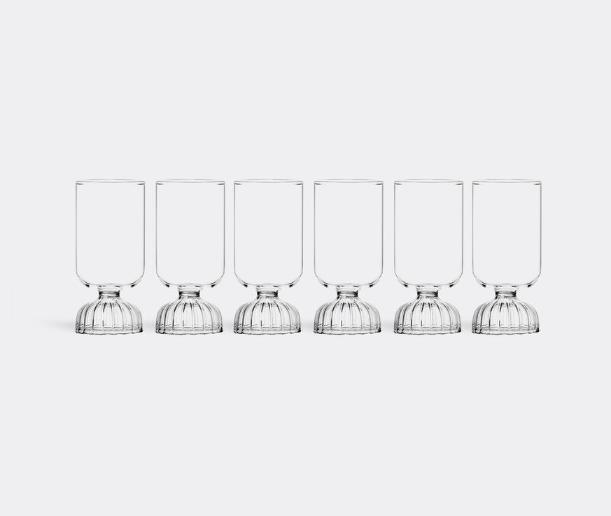 Designed by Mist-o for Ichendorf Milano, the 'Tutu' series brings together a series of lampworked and hand-made goblets, flutes and bowls. The 'Tutu' shot glass is presented in a set of six, with each borosilicate piece featuring a distinct expanding base in place of a traditional stem, which was born from Mist-o's memory of a ballerina's tutu.
