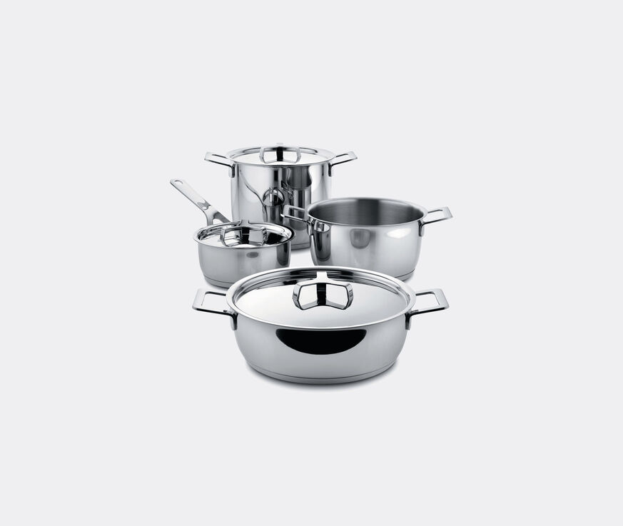A fully rounded set suited to all kitchens, Jasper Morrison's 'Pots & Pans' set for Alessi covers all bases. Including a stockpot, a casserole pot with two handles, a low casserole pot with two handles, a saucepan and three lids, all made from 18/10 stainless steel, the set is also suited to induction cooking thanks to a magnetic steel bottoms on the pots.