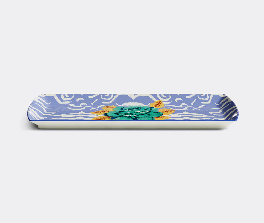 Lisa Corti's take on the tiger print conjures the look and feel of tiger stripes in motion, through asymmetrical, swirling, textured lines. This statement porcelain tray, which features as part of the 'Indian Tiger' collection, layers a turquoise and gold botanical motif onto a lilac and white tiger stripe. Suitable for everyday use, and formal table set ups, the multicolor 'Indian Tiger' tray can be mixed and matched with other Lisa Corti tableware for an elegantly maximalist on-brand look.