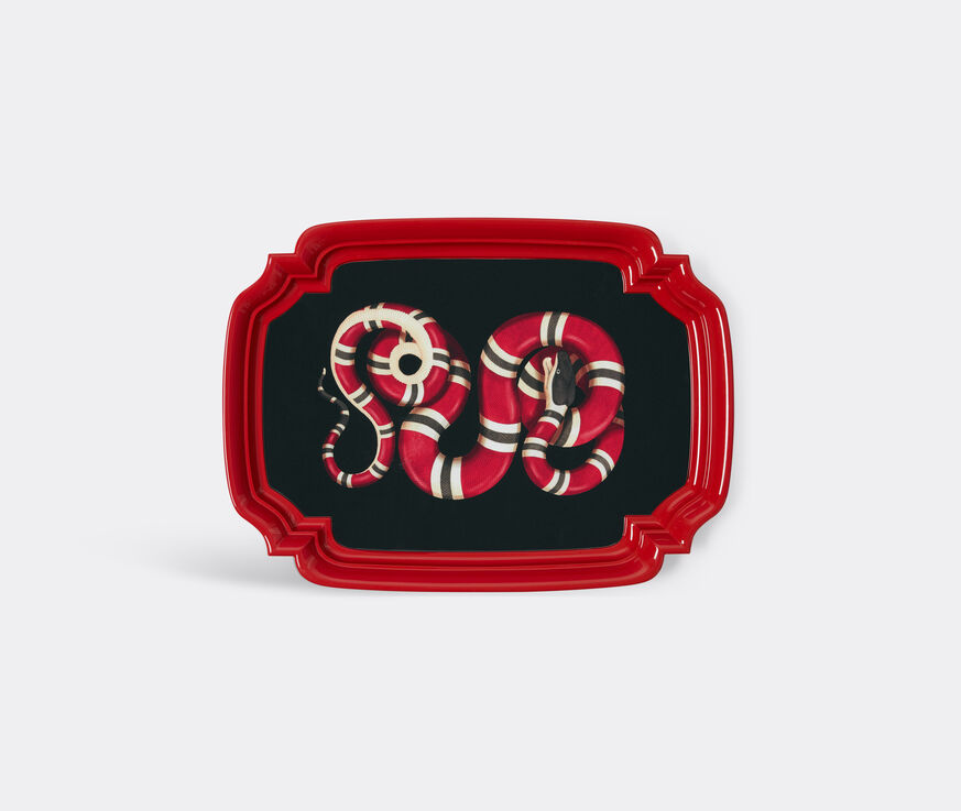 A bold kingsnake slithers and trails to create the surface design on this metal tray. Taken from the new Gucci Décor collection, which brings Gucci to the home, the large chiselled tray captures the snake's unmistakable allure and replicates a theme often seen in Alessandro Michele's ready-to-wear collections for the brand. Rimmed with a red border, the rectangular black tray is equally suited to serving and displaying and can be coordinated alongside pieces from the same collection in various sizes. Hand wash only.