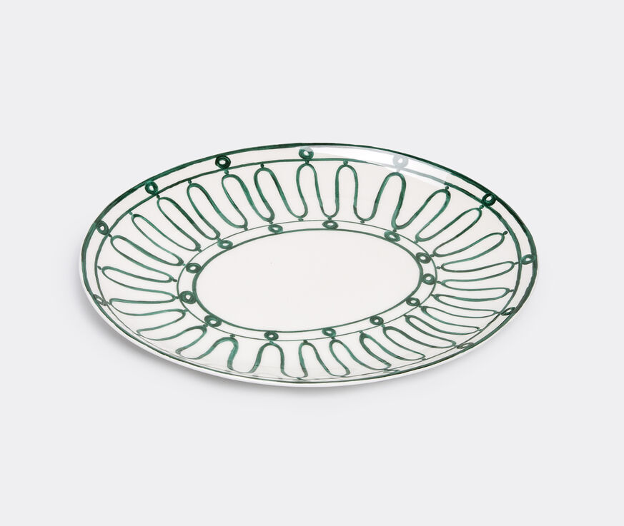Artisanally crafted in Greece, the fine porcelain 'Kyma' serving plate is handpainted with soothing and yet animated continous lines, recalling the movement and mood of the Aegean sea. Presented in a deep green, the piece sees Hellenic spirit come alive in a clean, classic design. Maximize the aesthetic with other tableware from the THEMIS Z collection.