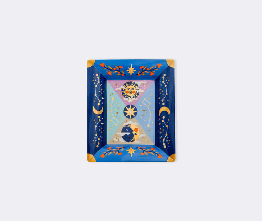 Berlin-based artist-illustrator Carmi Grau combines art and astrology in this atmospheric tray design for Bitossi Home. The porcelain 'L'Astrologica' tray brings together monochrome shades of blue to create depth. This composite, symmetrical design includes a range of celestial and botanical motifs in multicolor shades of gold, red and blue. The flat surface of the tray is divided into four diamonds, and features solar and lunar symbols. An eight-pointed star sits at the center of this beautifully balanced tray, which brings a sense of cosmic wonder to homes.