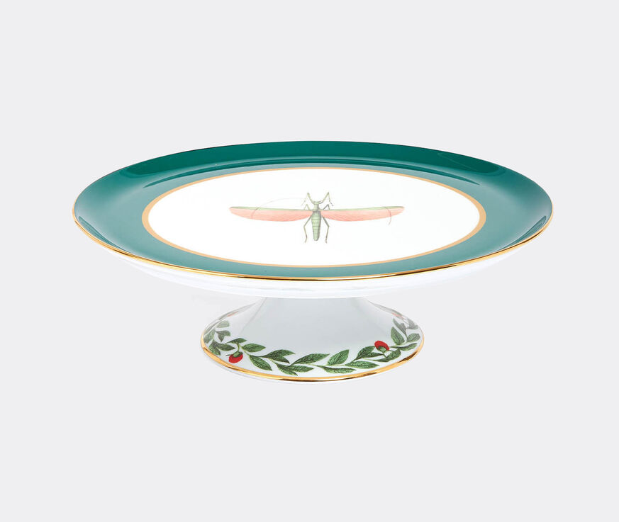 A handpainted dragonfly is the subject of this elegant cake stand by La DoubleJ. Centered on fine, white porcelain, the libellula embodies the delicacy and beauty of the material, and is depicted in meticulous naturalistic detail in shades of pink and green. This foot is encircled by botanical detailing, while the plate features a deep green border and gilt edging. An enchanting centerpiece, the 'Libellula' cake stand can be paired with other tea- and tableware from the collection for delightful displays.