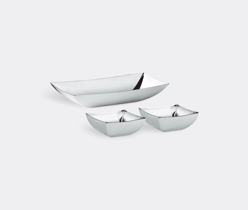A new addition to Sambonet's iconic 'Linea Q' collection, this set of stainless steel bowls look East for inspiration. The result is a series of pieces in which new geometries are established, further enhanced by bright surfaces and functional design. This set includes two square bowls and a bread basket, and is presented in elegant packaging that also makes it suitable for a gift.