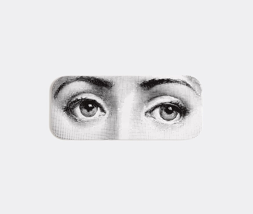 Emblazoned with the eyes of Lina Cavalieri, Fornasetti's 'Occhi' tray takes a familiar brand visual and reintroduces it in a fresh light. Hand applied and presented in muted tones of black and white, the eyes cover a rectangular wood tray that is supplied with a foldable stand so that it may be transformed into a coffee table with ease.