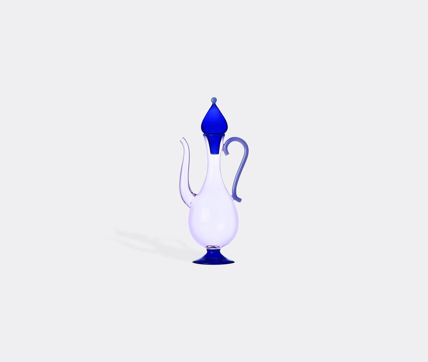 This highly-stylized jug for Ichendorf Milano conjures the magic of One Thousand and One Nights in a clear and midnight blue glass. Alessandra Baldereschi’s opulent vision combines watery colors in fluid, elongated lines and curves that sprout from a tear-shaped body. Topped with an opaque green orb on a shapely stopper, the 'Sogni D’Oriente' jug reimagines the spouted water jugs or ewers of Islamic art, traditionally crafted in metal. This dreamlike design made entirely from borosilicate glass transforms surfaces and spaces in an instant.