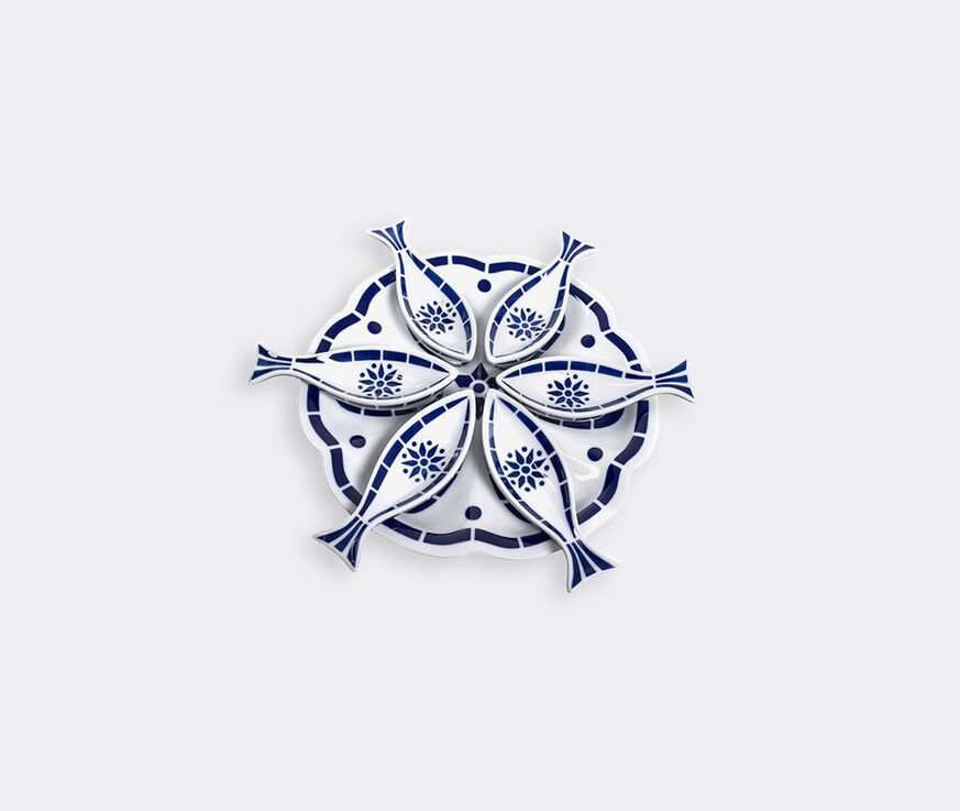 Created by Sargadelos, the 'Tapas Peixe' set offers a taste of Spain, figuratively and literally. Designed to serve an assortment of tapas, the Spanish-made set comprises one tray and six tapas plates, all cut from white porcelain and featuring an intricate blue motif. Dishwasher and microwave safe.