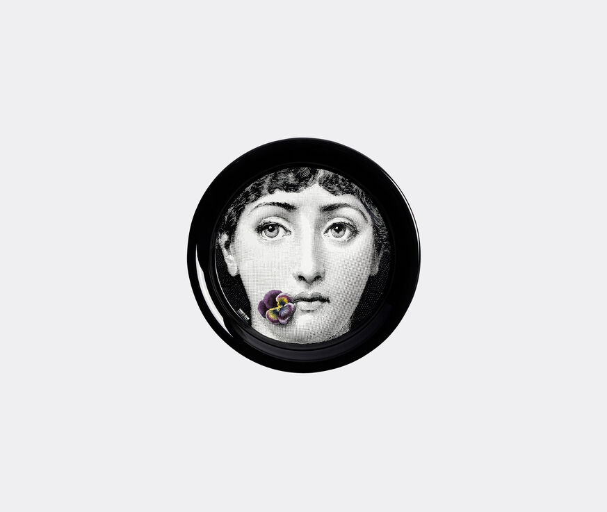 The stylized face of opera singer Lina Cavalieri defines the 'Tema e Variazioni' series by Fornasetti, appearing across a selection of signature pieces. This hand-decorated tray is a collector's must-have, which, when combined with a foldable stand, can be transformed into a striking coffee table. The 'Tema e Variazioni N.137' tray features Cavalieri's face in black and white monochrome, with a flower to the side of her mouth, in color. Products of fine artisanal craftsmanship, trays may display minor distinctions that make each piece unique.