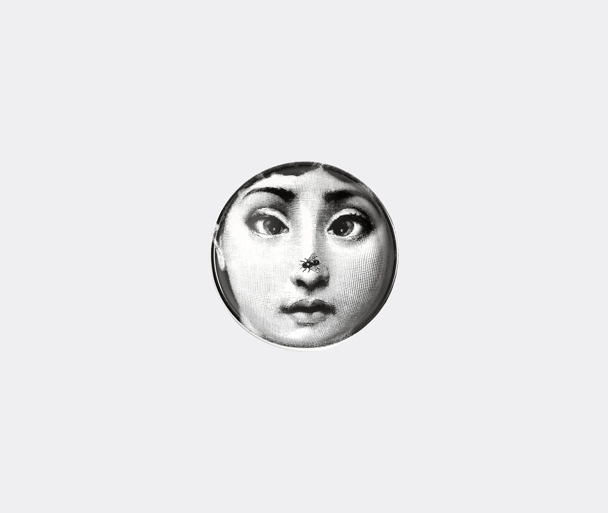 The stylized face of opera singer Lina Cavalieri defines the 'Tema e Variazioni' series by Fornasetti, appearing across a selection of signature pieces. In the hand-decorated round porcelain 'Tema e Variazioni N.363' ashtray, Cavalieri's face, in black and white monochrome, fills the entire design. Wide, almond-shaped eyes cross to observe a fly on her nose, a detail that captures the playful Fornasetti spirit. Products of fine artisanal craftsmanship, designs may display minor distinctions that make each one unique.