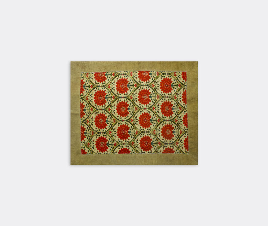 A thick border and a central, intricate floral print, punctuated by bold shades of red characterize The House of Lyria's 'Catera' placemat. Woven from 100% linen, and featuring a hand-sewn coffee dyed border with a hemstitch, the placemat is presented as a set of two and may be paired different items from the wider collection for a distinct tabletop charm.