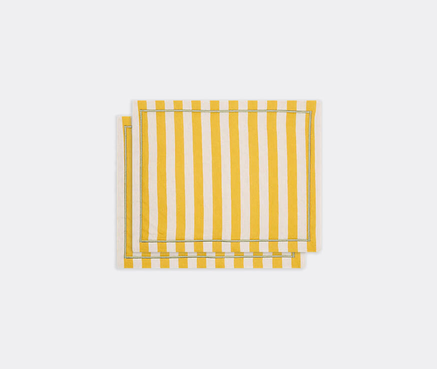 La DoubleJ's 'Riviera Giallo' table mat is a beautiful addition to the brand's maximalist table collections. Presented as a pair, the 100% linen table mats feature subtle padding and are marked by stitched borders and a discreet logo on the reverse side, while the 'Riviera Giallo' pattern, an eye-catching striped pattern in yellow and white, which adorns its entire surface and is joined by a light blue inner border. Made in Italy, the table mats may include some small, natural irregularities, such as small knots in the yarn.