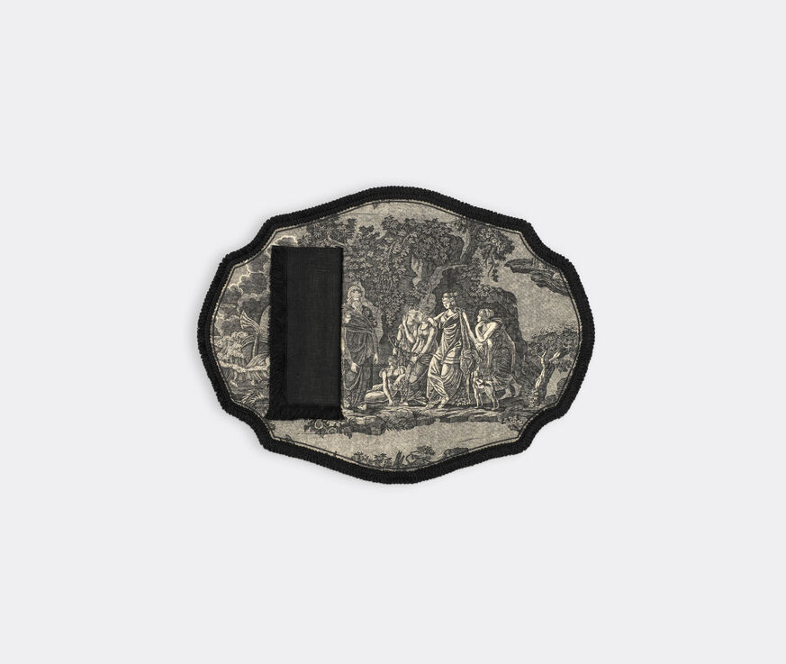 The house of Gucci's take on toile de Jouy comes to life on this tableware set, which pairs one linen napkin with a cotton placemat. At the front of the oval shaped place mat, the brand's interpretation of a toile de Jouy print is presented in black and white, with an elegant black braised trim and a dark red reverse side. It all makes for a chic tabletop decoration that is further enhanced by the addition of a black napkin for a luxurious and sleek set that can be paired with other pieces from the brand's home collection.
