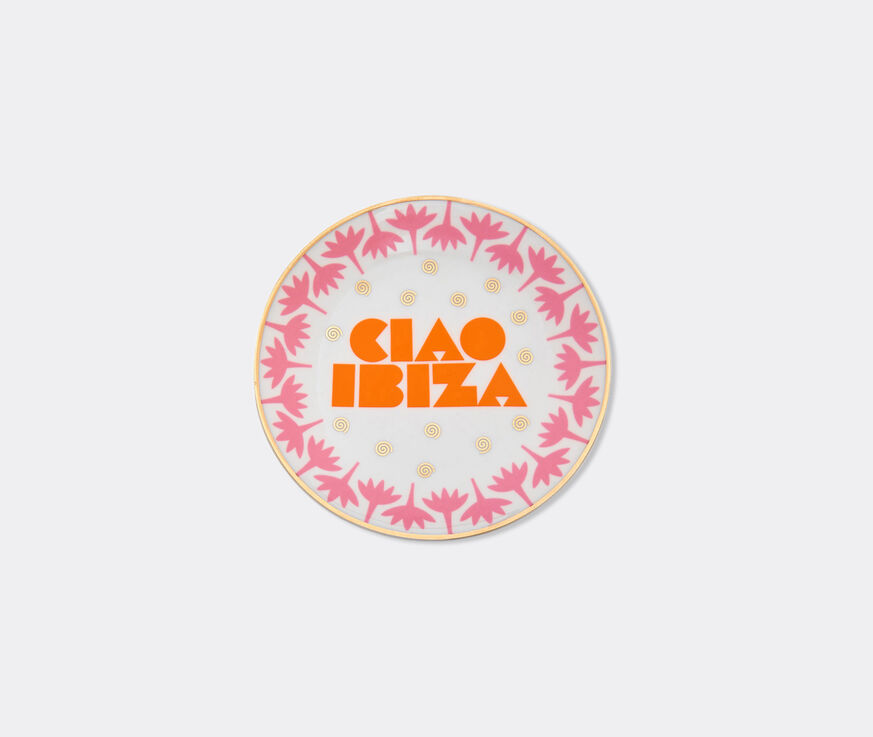 A chic reinterpretation of the souvenir plate, Bitossi Home’s 'Ciao Mundo' collection captures the spirit of individual cities in fine porcelain. Stylized graphics by Milan-based studio La Tigre incorporate symbols and urban texture into each piece. With a geometric botanical border in pink, and gold swirl detailing, the gilt-edged Ibiza plate evokes the creative, hedonism and bohemian energy of the island. The message 'Ciao Ibiza' is embellished in bold 1960s lettering in orange. Plates can be displayed individually or incorporated into tablescapes, adding color and character. Dishwasher safe.