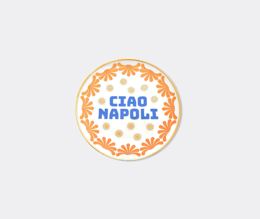 A chic reinterpretation of the souvenir plate, Bitossi Home’s 'Ciao Mundo' collection captures the spirit of individual cities in fine porcelain. Stylized graphics by Milan-based studio La Tigre incorporate symbols and urban texture into each piece. With its gold sunbursts and border of floral tendrils, the gilt-edged Naples plate pays homage to the city's architectural heritage and Ancient Greek relationship to the sun. The message 'Ciao Napoli' is embellished in modern blue type in the center. Plates can be displayed individually or incorporated into tablescapes, adding color and character. Dishwasher safe.