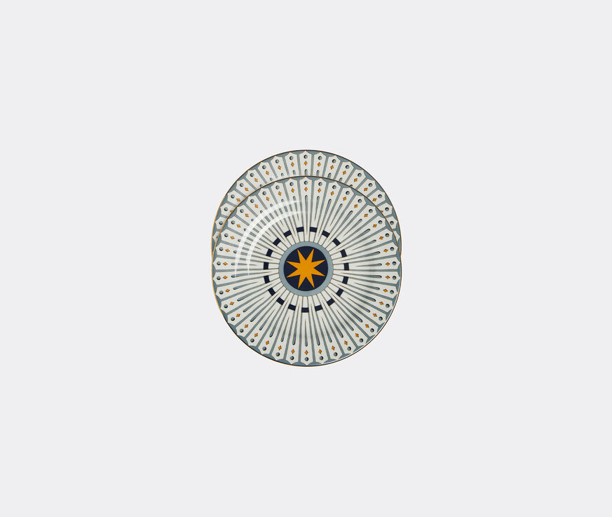 The ancient symbol of the sun shines through a series of resplendent tableware designs by La DoubleJ. Uplifting and versatile, designs draw the power and spirit of the sun to tables all year. Shades of burning red, saffron and gold glean throughout the collection in solar wheels and geometric flame motifs. The 'Feria' dessert plate — with its eight-point astral center, and sun rays in cool monochromatic blues — is crafted by historic artisans in Verona from the finest porcelain, and is encircled with an 18K gold trim. This stunning multicolor plate, which comes as a set of two, harmonizes perfectly with other sun-inspired tableware by La DoubleJ.