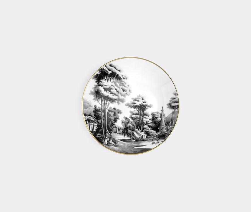 This decadent soup plate by Simone Guidarelli Home features a richly detailed garden scene in black and white, encircled with hand-finished gold edging. The landscape captivates with tall trees, a riverbank and imperial garden architecture. Part of a series of tableware that renders far flung places in monochrome, the design is drawn directly from Guidarelli's maximalist wallpaper portfolio. Suitable for soups, stews and pasta dishes, the 'Imperial Garden' soup plate can be layered with other pieces from the 'Souvenirs De Voyage' collection, or introduced into pared-black tablescapes as a statement in its own right. Not dishwasher safe.