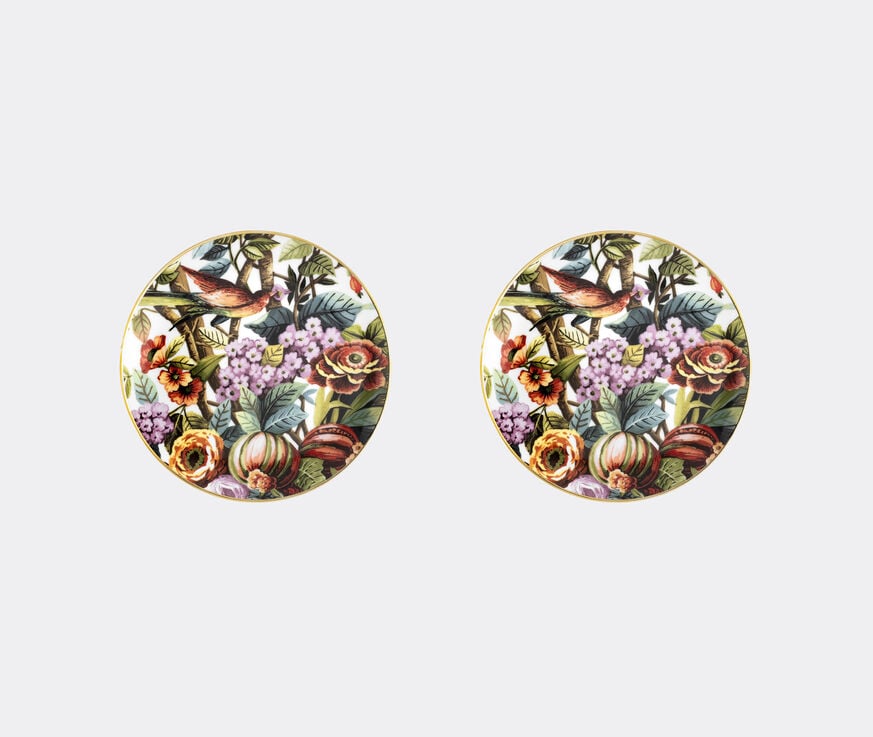 Simone Guidarelli Home's 'Jungle' collection unfolds in vivid color and playful motif. Set against a richly detailed floral base, the series tells an immersive visual story of tropical vegetation and fauna. Poetic and ethereal, this porcelain bread plate features a multicolor botanical design of red-toned leaves, violet flowers, and pomegranates on a white background. Hand-finished with 24k gold edging, each layer of color is masterfully applied by hand. This smooth and durable set of two can be harmonized with other pieces from the collection, bringing an exotic elegance to tabletops. Not dishwasher safe.
