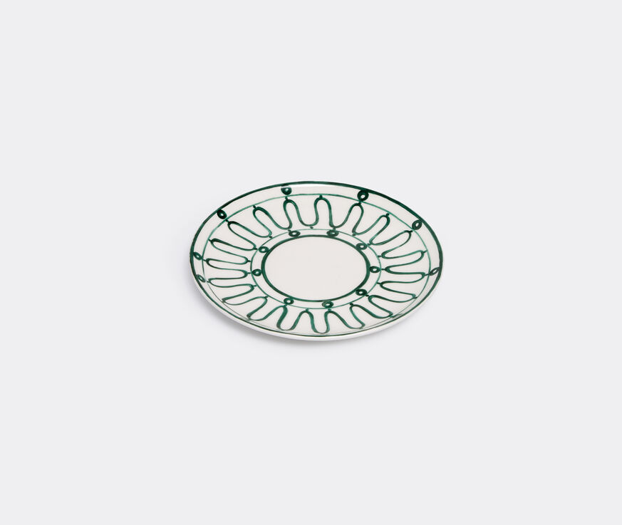 Artisanally crafted in Greece, the fine porcelain 'Kyma' dessert plate is handpainted with soothing and yet animated continous lines, recalling the movement and mood of the Aegean sea. Presented in a deep green, the piece sees Hellenic spirit come alive in a clean, classic design. Maximize the aesthetic with other tableware from the THEMIS Z collection.