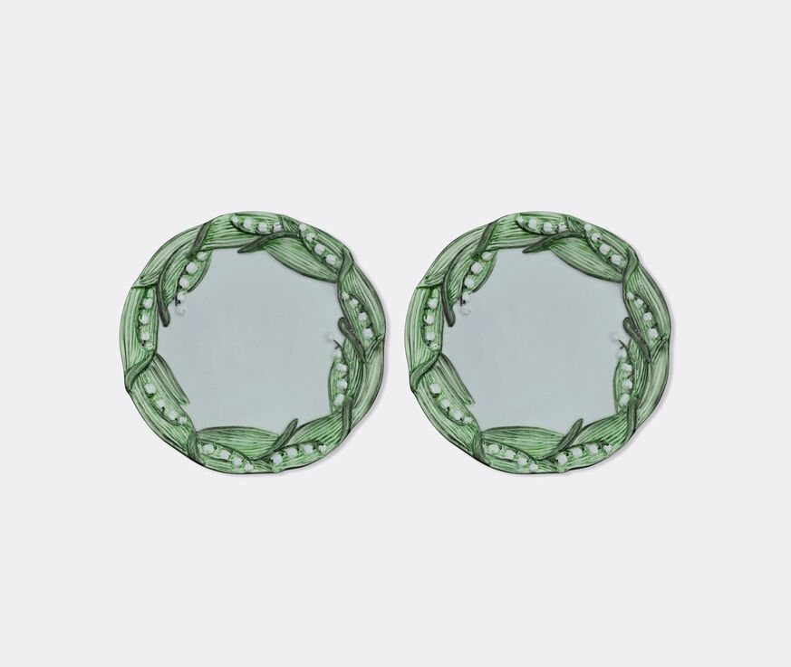 Les-Ottomons’ 'Lily of the Valley' series revives tabletops with its enchanting combination of fresh green leaves and white woodland flowers. This simple white bread plate is encircled with a bold yet delicate decorative design of handcrafted foliage and bell-shaped blooms. This elegant set of two can be blended with other tableware from the collection for a fuller, harmonious look.