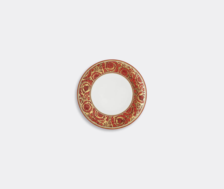 An ornate medley of elaborate baroque plants and flowers alongside Versace's famous Medusa head form the brand's new 'Medusa Garland' motif. Joined by rich tones of red and gold, this delicate decoration adorns the edges of this round porcelain dinner plate, for a functional celebration of Versace's most iconic emblem.