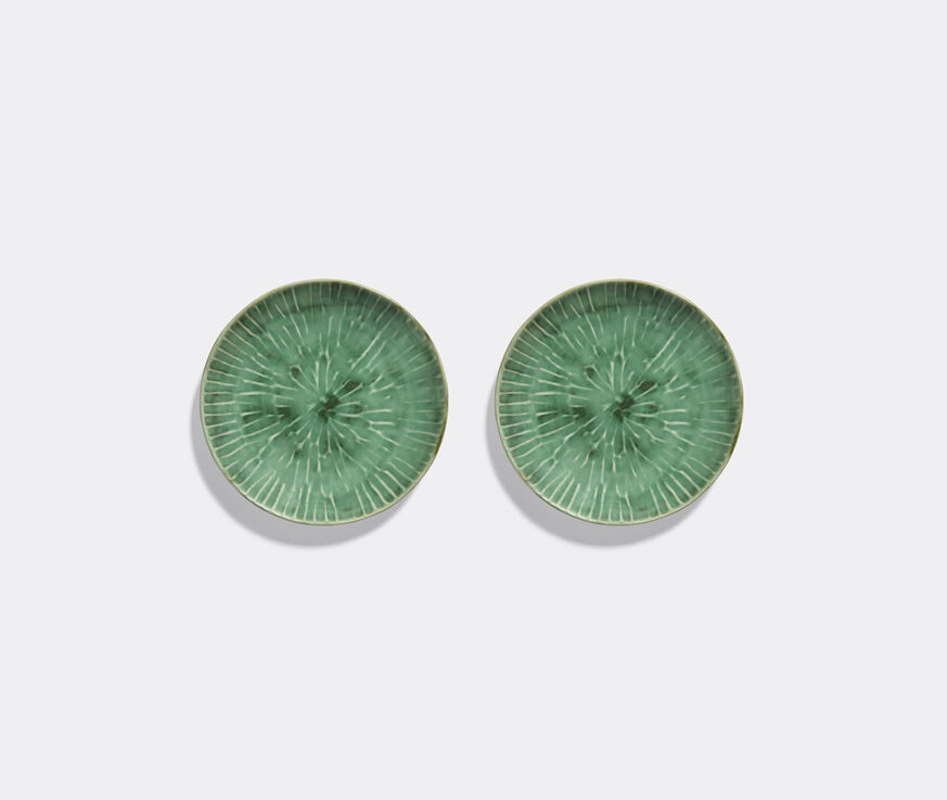 Designed by Pascale Naessens, 'Verde Lanza' takes inspiration from the island of Lanzarote. The series for Serax translates into tableware the role that the color green plays in the island’s unique aesthetic. A series of pieces captures the traditional green-painted windows and doors — and sparse, succulent vegetation — that create bursts of color in this otherworldly landscape. Each design is enriched with a unique texture — imprinted by the designer herself — that recalls volcanic formations. This starter plate set of two is defined by its sun-worn glaze, radiating pattern, and rustic, artisanal feel. The set can be added to with dinnerware from the collection for the complete look.