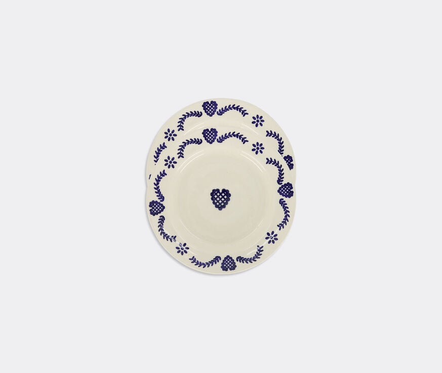 House of Capricorn’s 'Viana' collection encapsulates the brand’s focus on authentic artistry and heritage. This stoneware dessert plate is handpainted in blue with a traditional floral design, featuring a latticework heart against a warm beige background. Motifs symbolize the folklore and love of the land in the Viana do Castelo region of Portugal. This durable and delightful set of two can be styled with matching tableware and linen from the same series for elegant everyday dining.