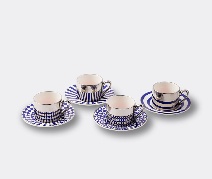 A playful study in illusion, the 'Aunty' espresso cup by Polspotten pairs a metallic mirrored cup with a patterned saucer to ingeniously blur the distinction between pieces. Four distinct patterns continue beyond the edge of the saucer, reppearing and refracting. The saucers in this fun set of four by the Dutch brand features swirls, concentric rings, radiating lines and diamonds, all rendered in dark blue. Pieces can be combined with other cups and mugs from the series for the complete look.