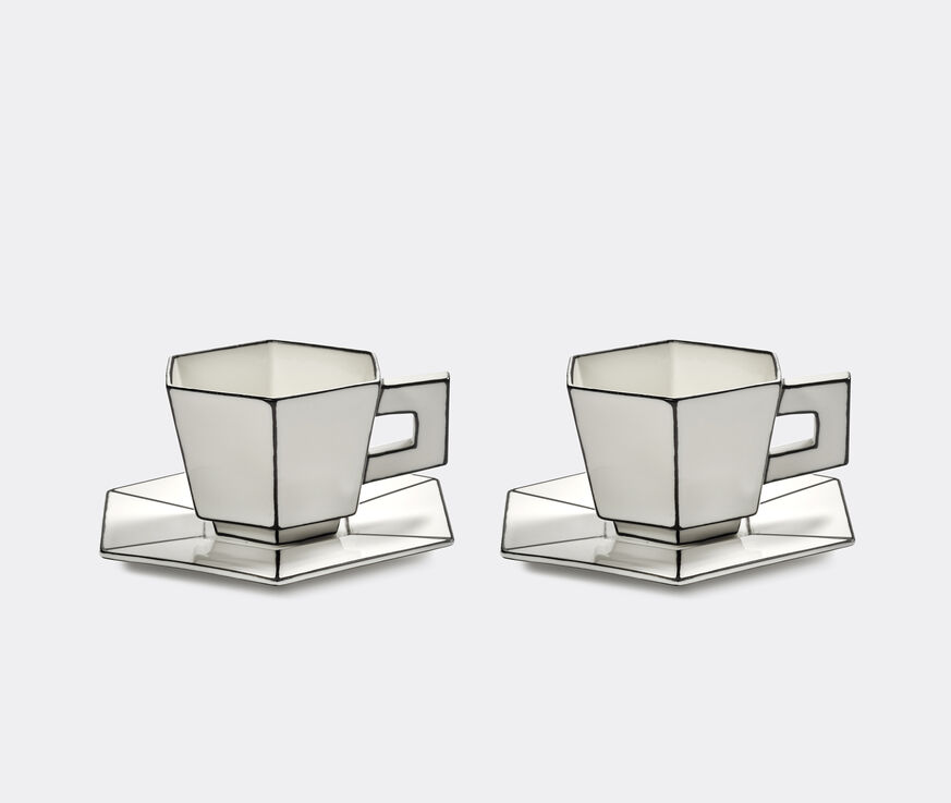 This playful tea and coffeeware series ingeniously reimagines cardboard cutouts in fine porcelain. Dutch designer Annebet Philips creates clean and geometric pieces characterized by 'paper' folds highlighted with handpainted lines. Combining angular edges with multiple smooth, flat surfaces in white, this cappuccino cup and saucer captures the aesthetic of paper-craft in an elegant finished piece. The set of two can be paired with other 'Carte Blanche' designs by Serax for a unique statement look.