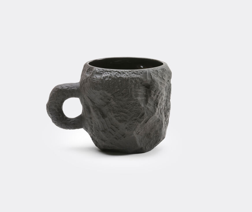 Developed by Max Lamb in collaboration with 1882 Ltd, 'Crockery Black' is a modern interpretation of Josiah Wedgwood's black basalt. Here, tableware slip cast from hand carved plaster models are rendered in the material with a rustic and uneven surface that mirrors the plaster original. The result in this instance is a deeply pigmented black mug that offers a pleasing contrast between its glazed interior and a roughly sculpted exterior.