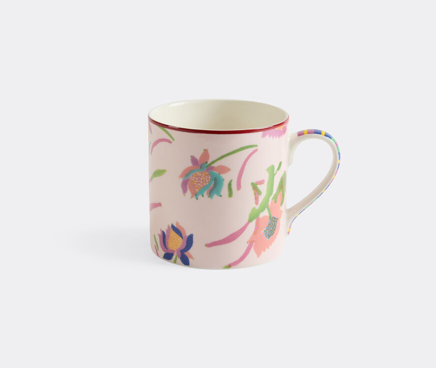 Lisa Corti’s 'Japanese' tableware collection captures the brand's love of energetic color and block print. This dynamic drinking mug is inspired by traditional Japanese floral painting. Bold primary colors blend with soft pastel shades in surprising combinations characteristic of the atelier. This colorful piece is crafted from fine porcelain and features abstract flowers strewn in bright and delicate shades over a light pink background. A geometric stripe on the handle, and a dark red rim, add contrast and dimension. The mug set can be paired with other tableware from the same line for elegant, chromatic displays. Dishwasher safe.
