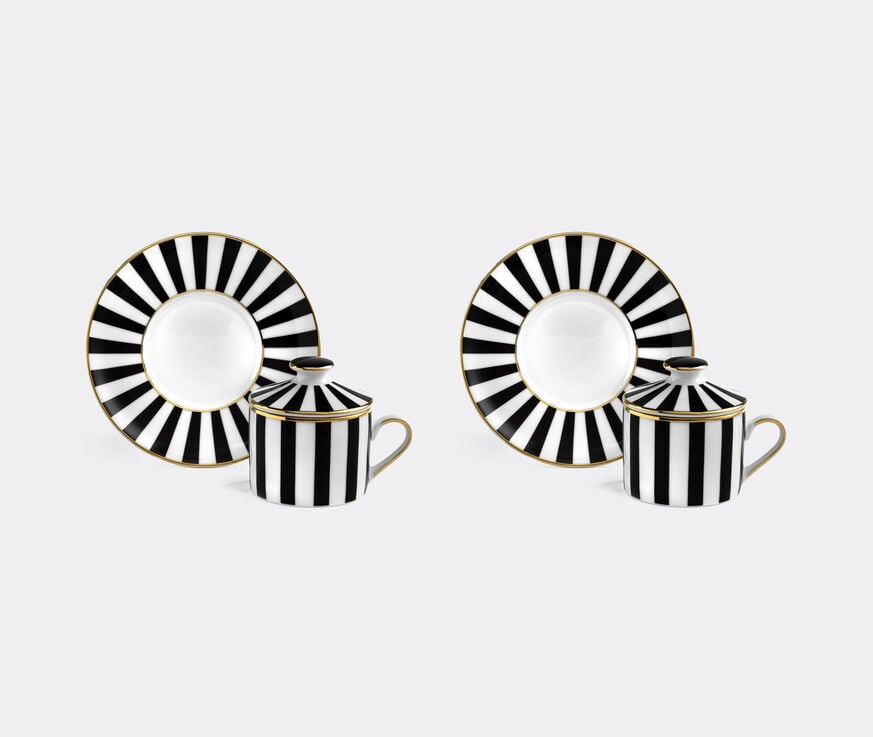 This decadent lidded teacup and saucer by Simone Guidarelli Home is decorated with a bold, black-and-white stripe throughout. The pattern encircles the cup, and radiates outwards on the lid and saucer. Each piece is hand-finished with gold detailing on the edges and handles. Part of the 'Souvenirs De Voyage' collection, this elegant set of two can be combined with the matching milk jug, teapot and sugar bowl for a sophisticated, high-impact look. Not dishwasher safe.