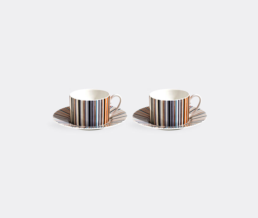 Combining Missoni's signature multicoloured stripes with fine bone china, the 'Stripes Jenkins' series is a lively selection of fashion accessories for the home. This set of two teacups and saucers features a linear print that spans warm to cold colours, and may be paired with other items from the 'Stripes Jenkins' family.