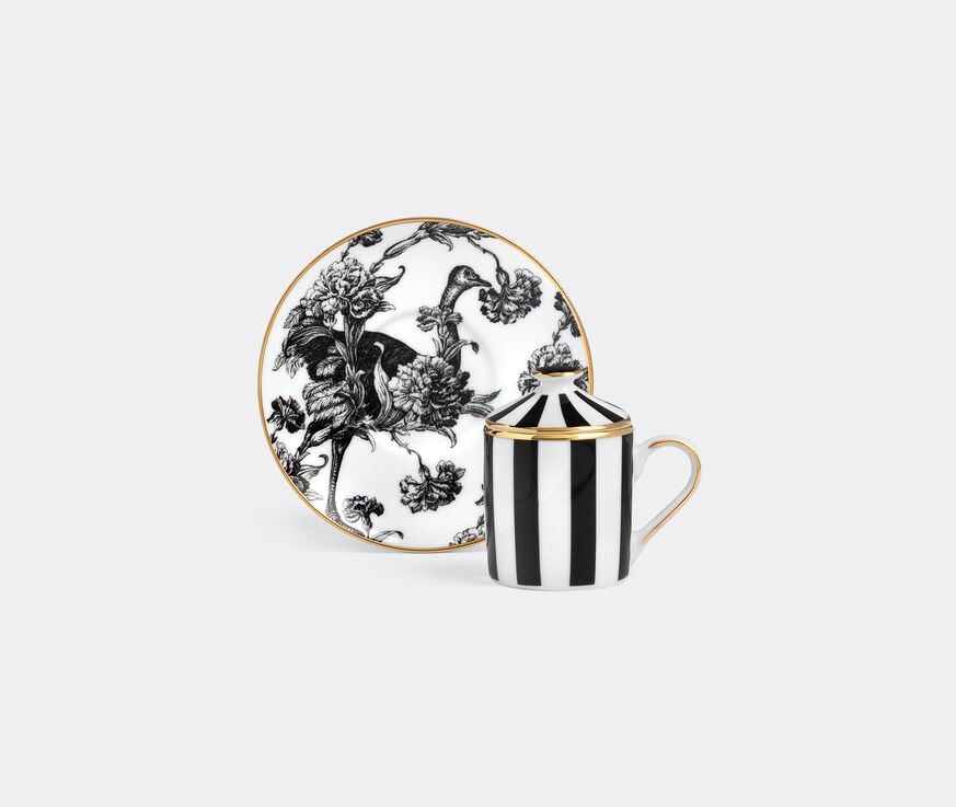 This lidded espresso cup and saucer by Simone Guidarelli Home combines the two visual threads that make up the 'Souvenirs De Voyage' collection: graphic stripes and intricate illustration. The cup is encircled with a wide black-and-white stripe, which radiates outwards on the matching conical lid. The contrasting saucer evokes an intricate scene featuring an ostrich amid ruffled flowers, tangerines, and foliage, drawn directly from Guidarelli's maximalist wallpaper portfolio. All three monochromatic pieces are decorated with hand-finished gold detailing. The 'Tangerine Garden' espresso cup and saucer can be blended with matching pieces for a full, harmonious look. Not dishwasher safe.