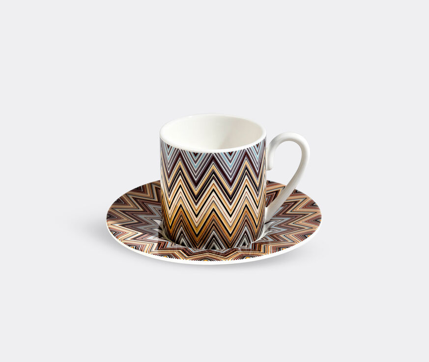 Fashion brand Missoni has been producing knitwear bearing its signature zigzag motifs, stripes, waves and slub yarns since 1953. The 'Zig Zag Jarris' collection, with its multicolour zigzag print in bright tones, is a great example of how the brand has successfully adapted these same themes for homeware items produced by Its interiors spinoff — MissoniHome. This coffee cup and saucer set brings together intense browns, pastels and sky-coloured hues for a duo suited to all occasions.