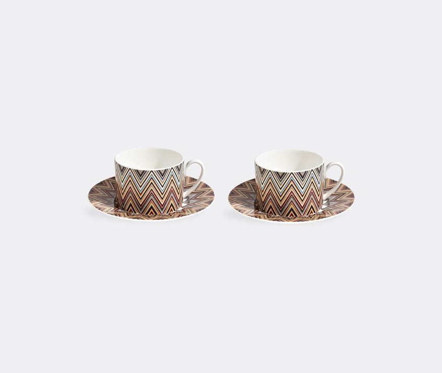 Fashion brand Missoni has been producing knitwear bearing its signature zigzag motifs, stripes, waves and slub yarns since 1953. The 'Zig Zag Jarris' collection, with its multicolour zigzag print in bright tones, is a great example of how the brand has successfully adapted these same themes for homeware items produced by Its interiors spinoff — MissoniHome. This teacup and saucer set brings together intense browns, pastels and sky-coloured hues for a duo suited to all occasions.