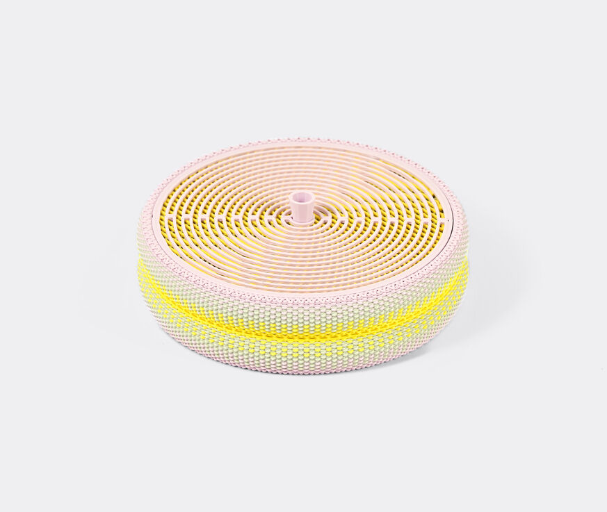 Weaving artisanal craft with new technology, the 'Gradient' collection by Wontek is 3D-printed in the brand's Warsaw atelier. The line of 'woven' digital objects includes this expressive and tactile storage box. An intricate geometric pattern, in bold shades of lilac, yellow and grey, is inspired by traditional folk motifs, and dissolves into a soft, optical gradient. Produced from a renewable and compostable bioplastic, this large circular box is an ornamental solution to storing small treasured items throughout the home, everywhere from desks to dressing tables.